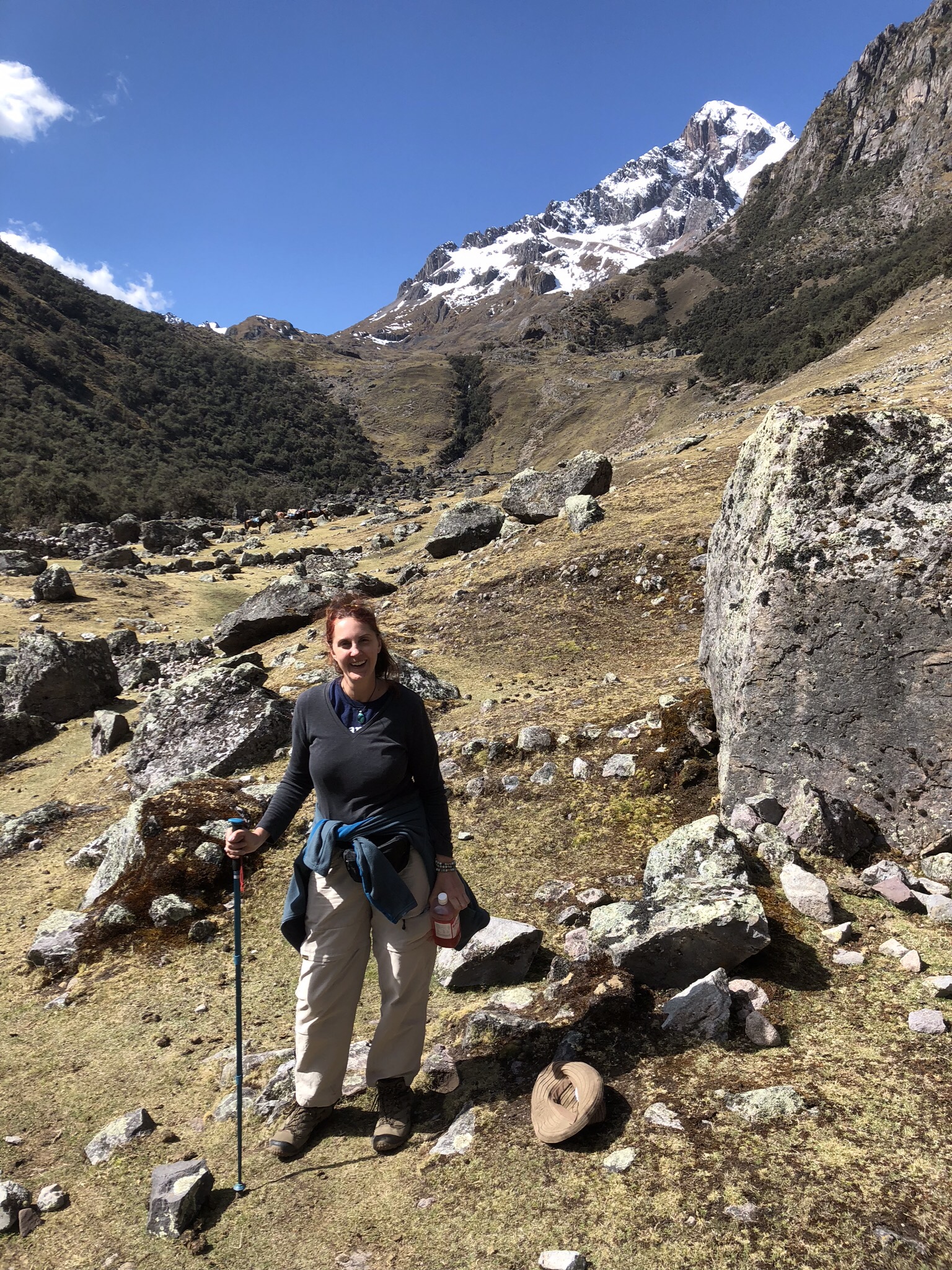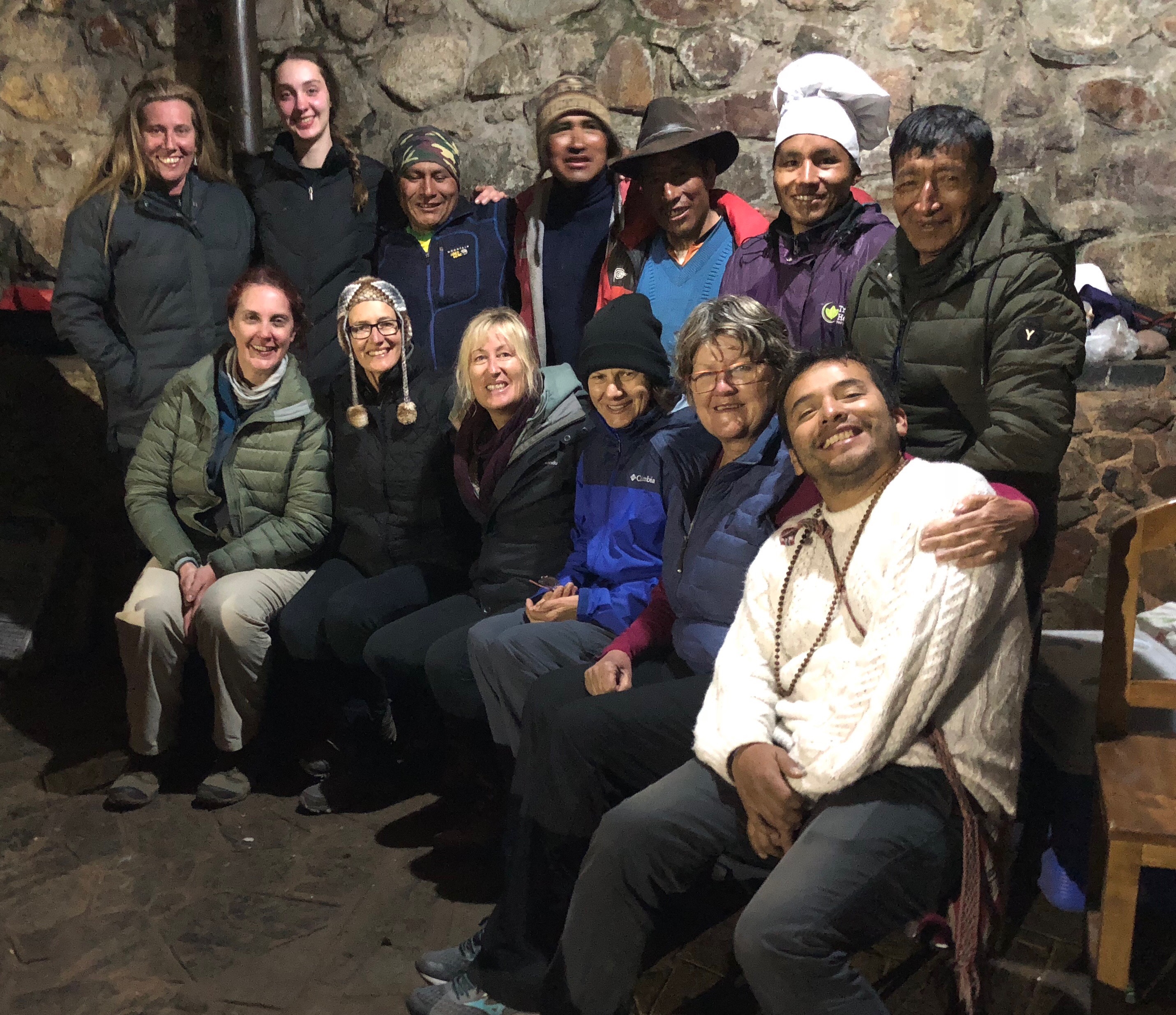 After dinner Angel (who speaks English, Spanish and Qeros) explained a bit more about Alejandro’s ancestors. Alejandro is Qeros and speaks primarily their language. The Qeros people are a pre-Inca indigenous people and shamanism is handed down through families. They believe in many of the same gods as the Incans. All are linked to Mother Earth and the Qeros believe their knowledge comes from the earth and water. Alejandro had been a constant smiling presence throughout the day. He led the climbing team all day, with Zoë close on his heels. In fact, for most of the day, Zoë and I didn’t see each other as she was the front of the pack and I was very much at the rear.