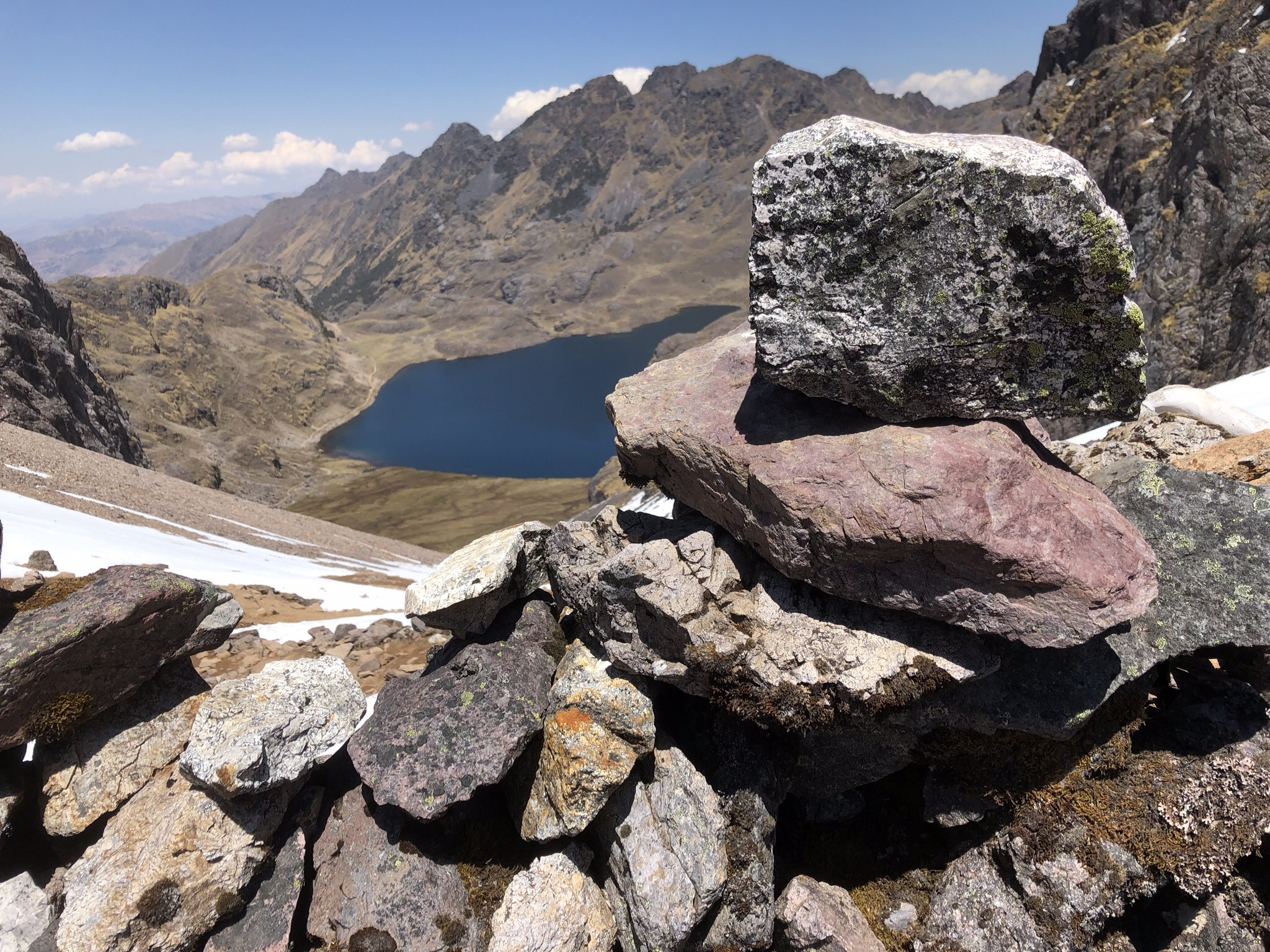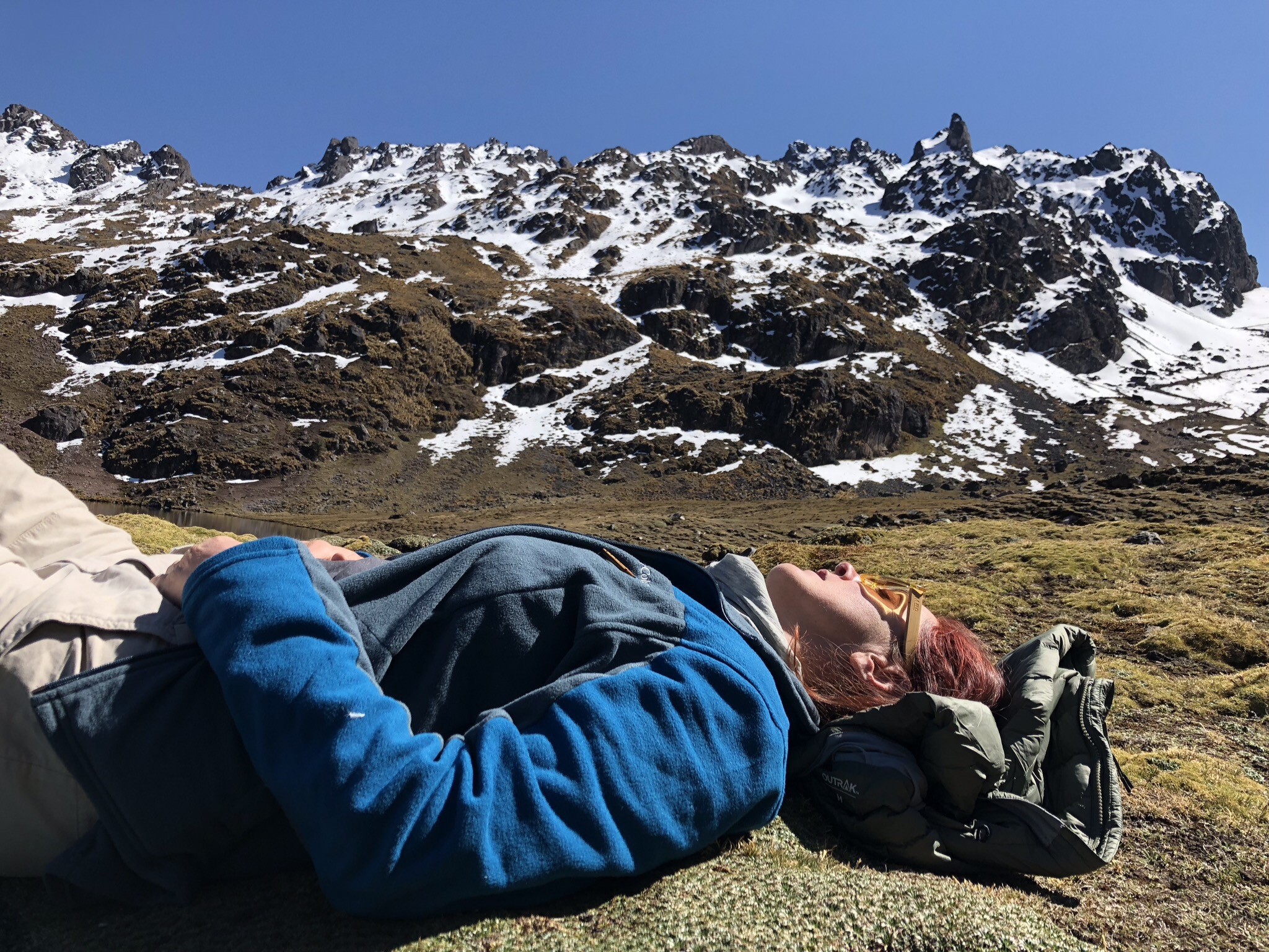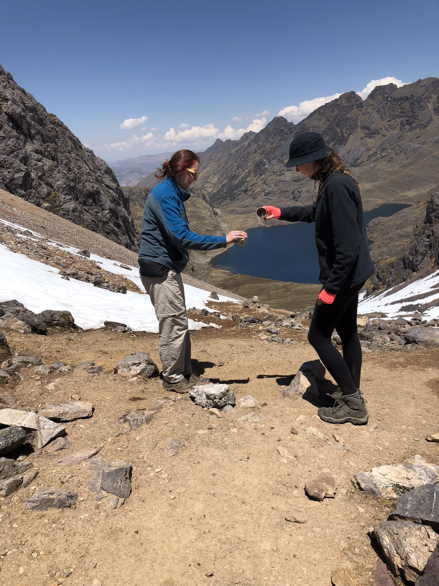 placeholder://After breakfast (more electrolyte solution for me), we headed to the top. We were on the trail by 6am. I was feeling sufficiently better that I could even carry my own daypack. We climbed steadily for the next three hours. We took a break just before the last push that would get us over the mountain. There was a beautiful lake in the early morning sunshine, the sun was glinting on the snow. We were at 4470m (14,665ft). No one wanted to move, but move we did. Onwards and upwards, through the snow and ice covered path.
