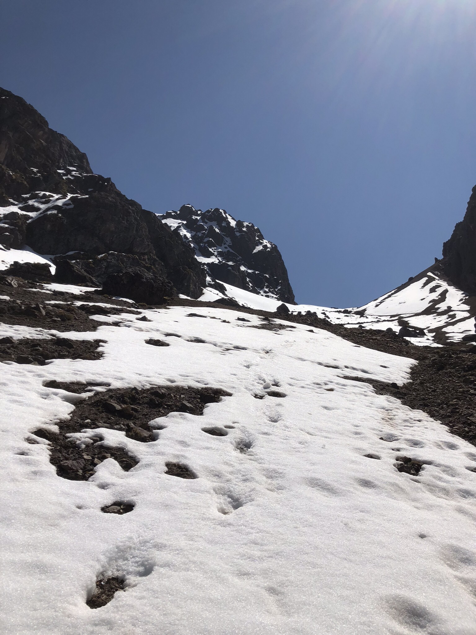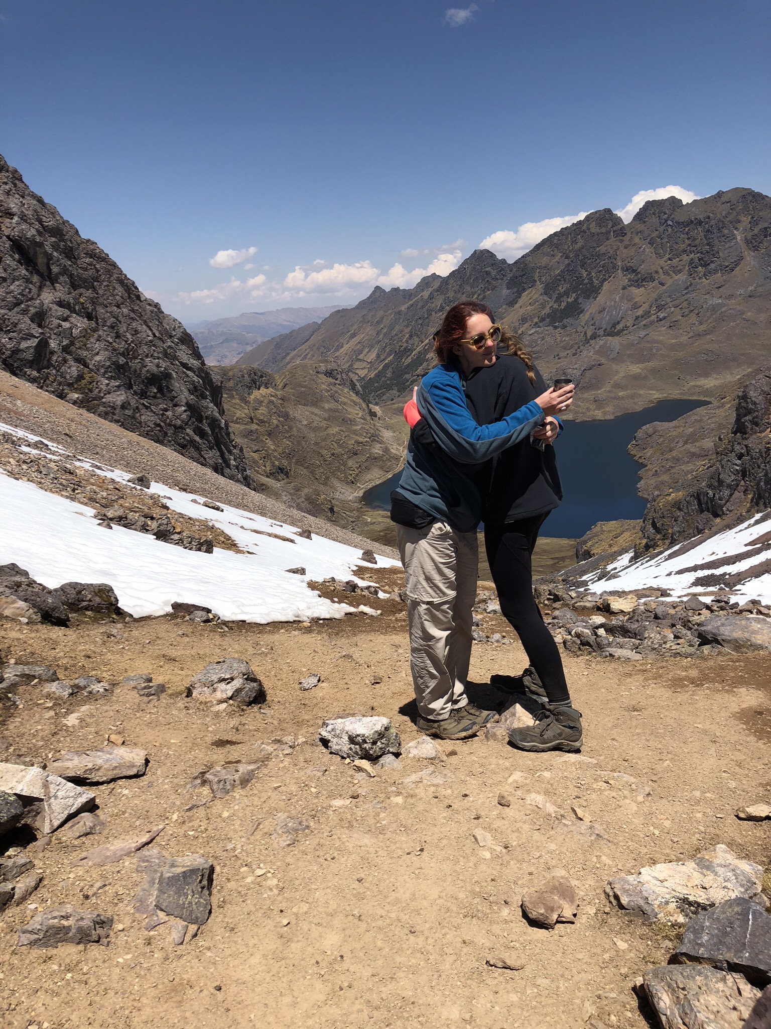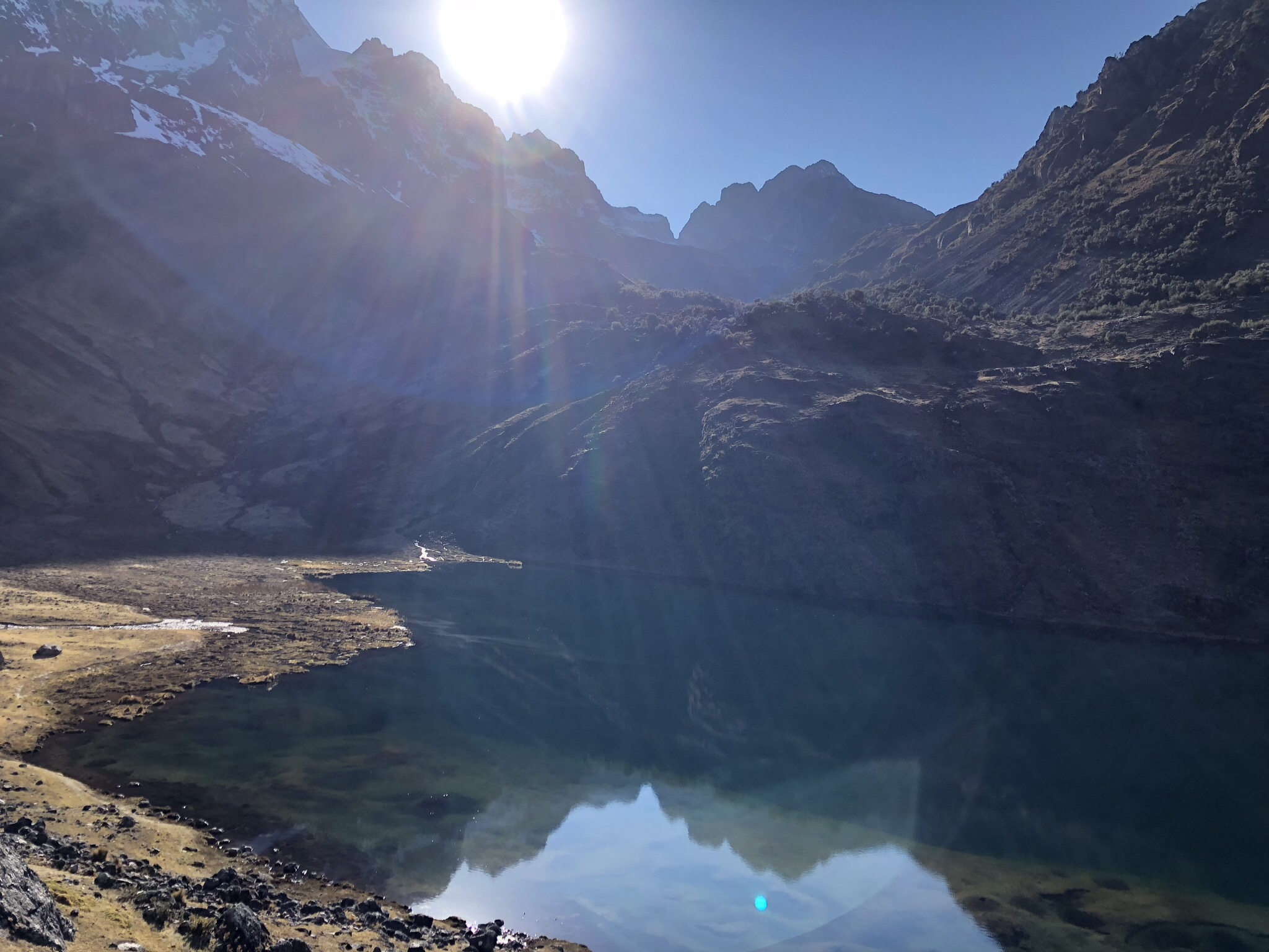 placeholder://After breakfast (more electrolyte solution for me), we headed to the top. We were on the trail by 6am. I was feeling sufficiently better that I could even carry my own daypack. We climbed steadily for the next three hours. We took a break just before the last push that would get us over the mountain. There was a beautiful lake in the early morning sunshine, the sun was glinting on the snow. We were at 4470m (14,665ft). No one wanted to move, but move we did. Onwards and upwards, through the snow and ice covered path.