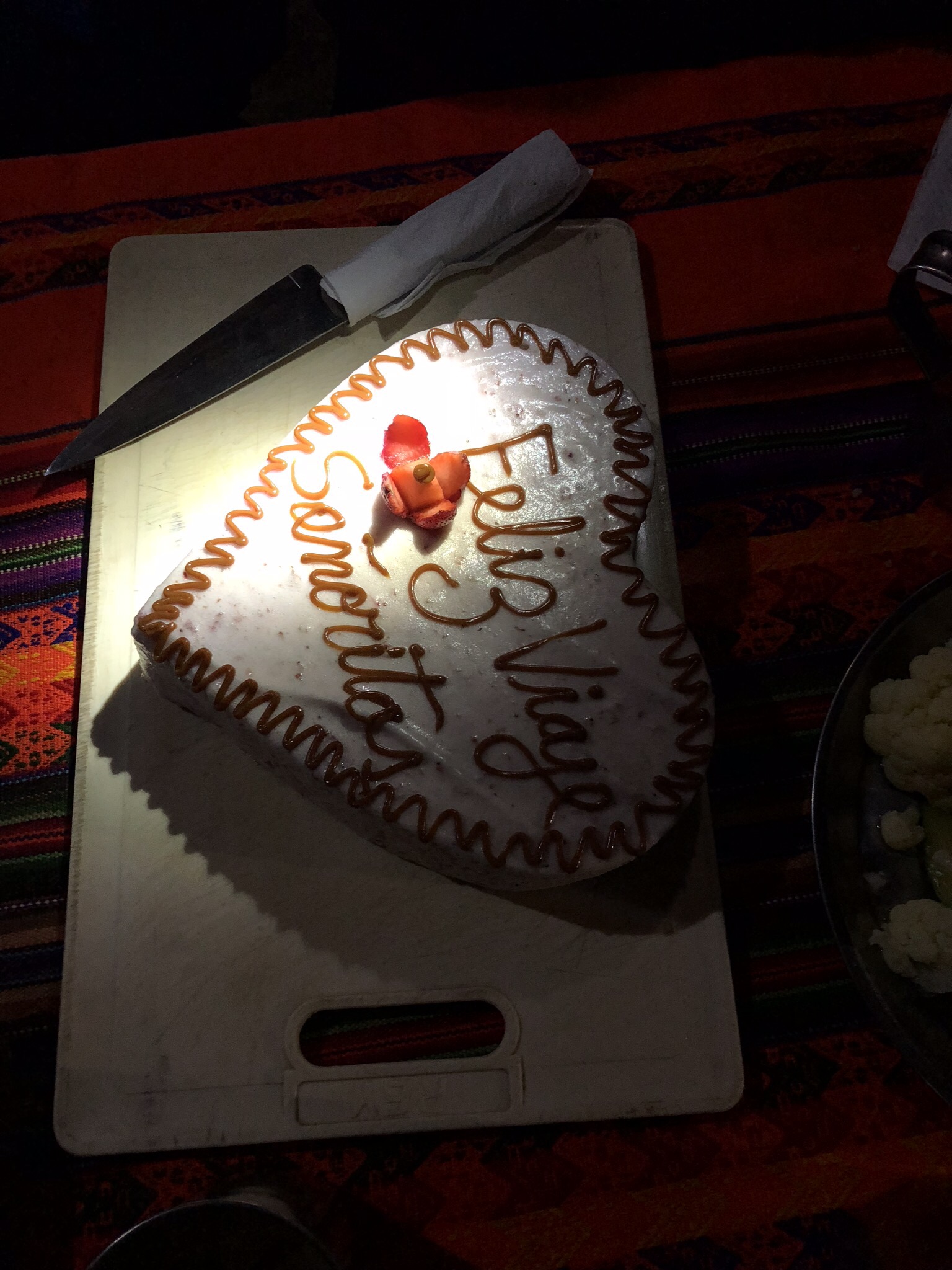 Tuesday night’s dinner became a bit of a party. Freddie made a strawberry mousse in a heart shape for all of us. We all stood around singing each country’s national anthems to each other (the camp staff did a great rendition of the Peruvian one). It put our Australian one to shame. Zoë even sang the Italian one since she knew it. Then we gave the staff their tips and thanked them for their amazing service. Carlos the horseman, Freddie the chef, Albert the chef assistant and the porter who I forgot his name, were all wonderful to us and we were very grateful for their help.