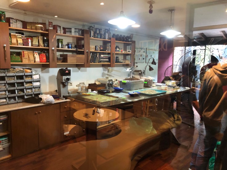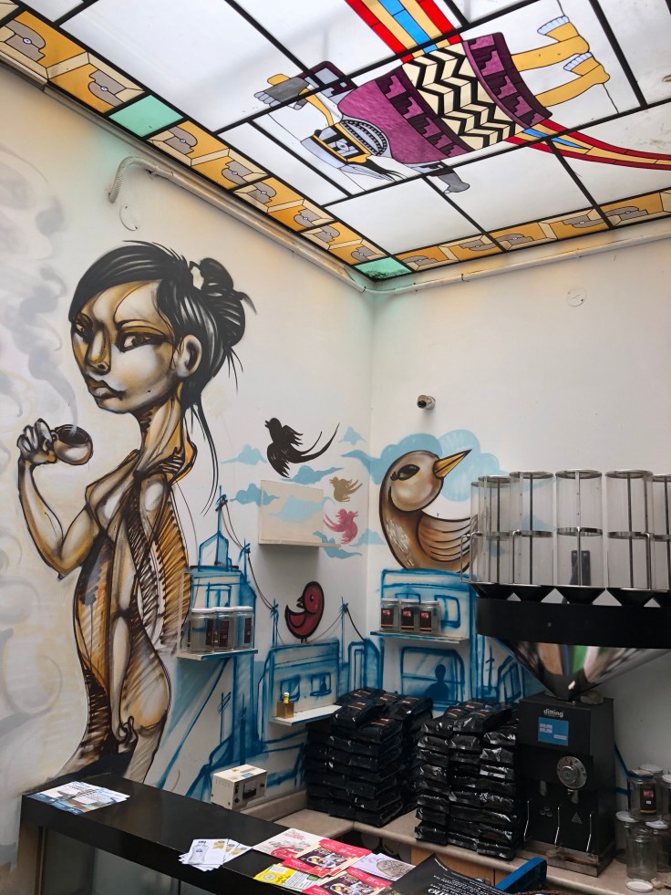 Our first foodie stop was a coffee roaster. They roast their beans on site and we all had different types of coffee. Zoë and I both had a mochacchino – espresso, milk and Peruvian chocolate. Delicious! They had a couple of coffee trees in the back courtyard so we were able to see coffee beans growing too. And of course, the inside of the cafe was decorated with fun artwork.