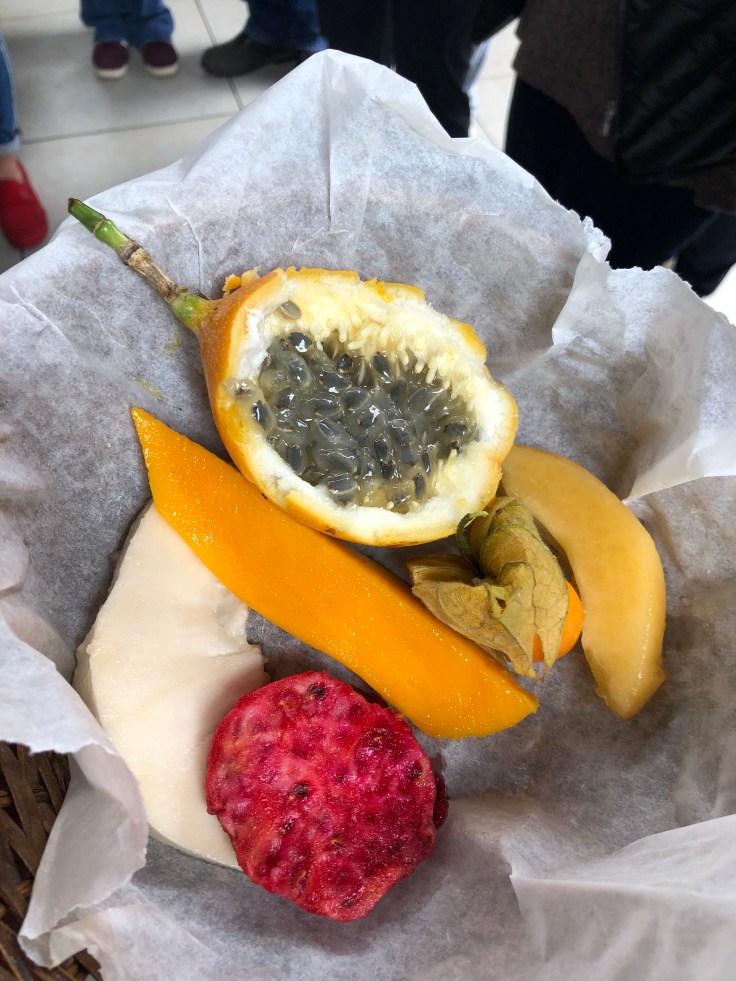 We moved on to the Miraflores market. Lourdes showed us a number of different types of fruit grown in Peru and then we were given samples to try. Peruvian passionfruit, mango, custard apple, cactus fruit and lucuma.