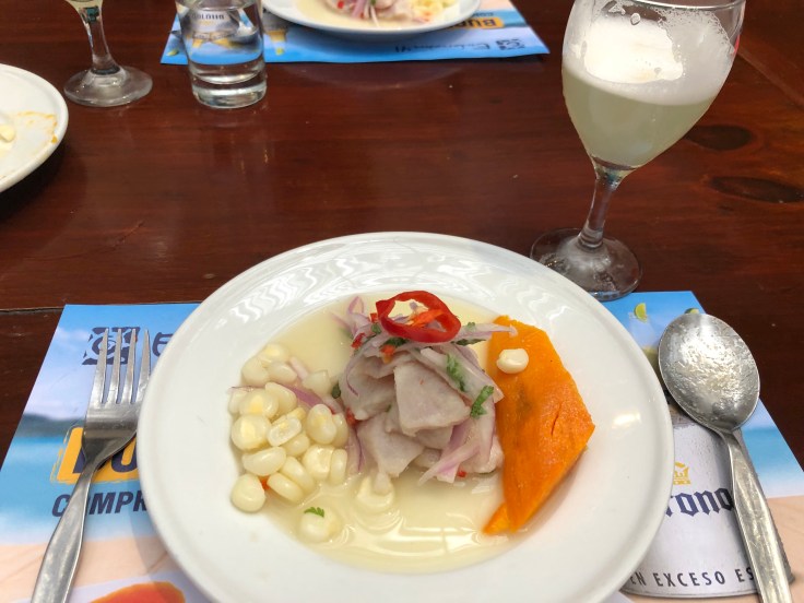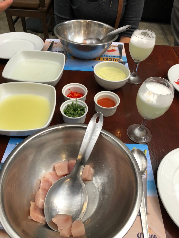 Then we were taught how to make ceviche. Raw white fish cooked in lime juice, chili, fish stock and then mixed with a special sauce of garlic, ginger, celery and a bit of mayonnaise for balance. It’s piled on a plate, served with sliced red onions, chilis, corn and sweet potato. Not only was it fun to make our own drinks and ceviche, by the time we’d finished, we were fairly full.