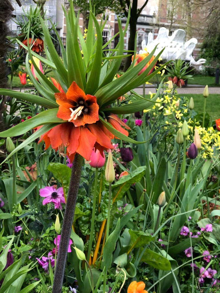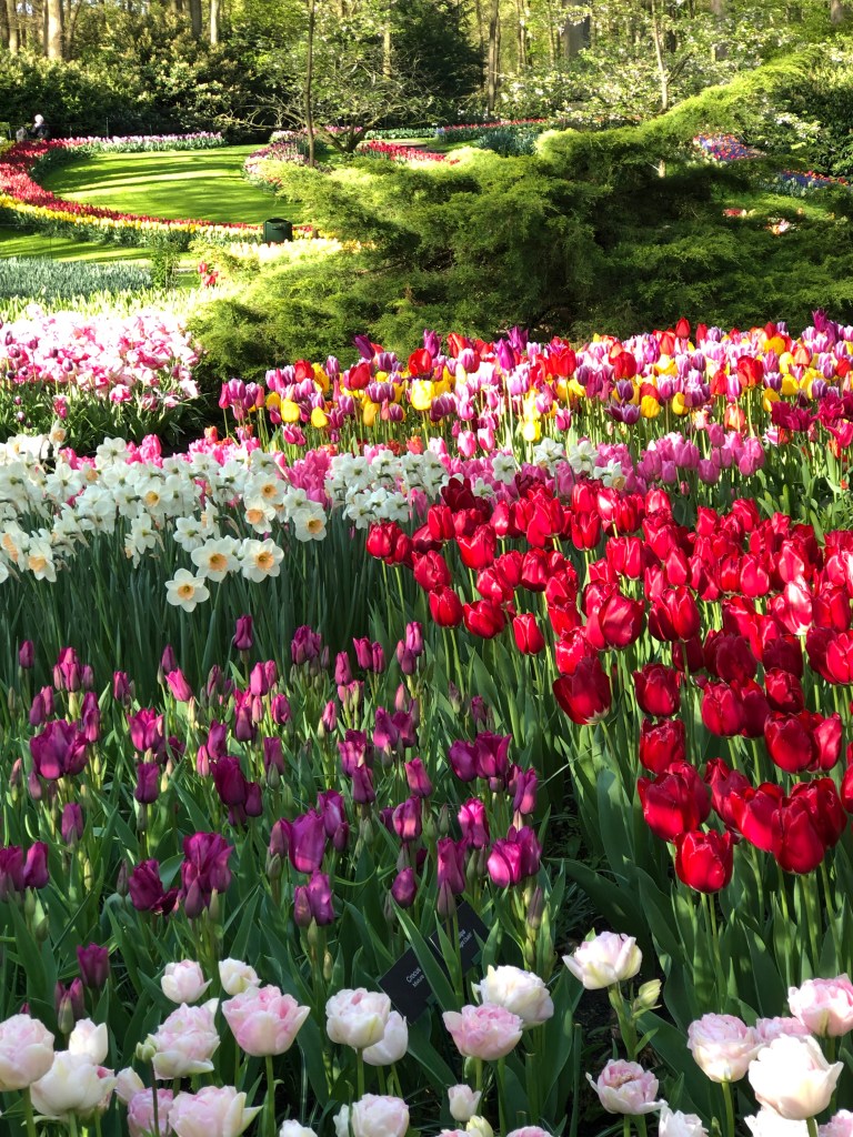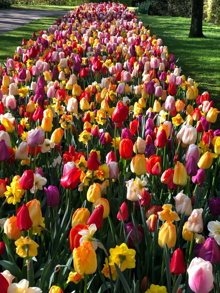 On Wednesday, we visited Keukenhof, the world’s largest tulip and bulb flower festival. We didn’t even know it was on until we arrived but were lucky enough to nab two tickets. Each day, this festival sells out and booking online is the way to go. We arrived at 8.30am when it opened, after a 30-minute bus journey from Amsterdam. The festival is held in 32 hectares of grounds and is the Netherlands’ largest visitor attraction, hosting more than 1 million visitors each year over the eight weeks it is open. More than 7 million tulips, daffodils, hyacinths, lilies and other bulb flowers are on display in stunning gardens. We were very fortunate to be some of the early visitors on the day we went. By 11.30 when we left, the gardens were teaming with people, where early in the morning we were able to see many displays on our own.