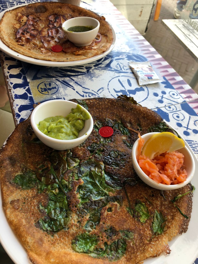 Anyone who reads this blog regularly knows, especially if you read the posts about my travel, I can sometimes struggle with food as I have coeliac disease and must eat gluten free. In Amsterdam, it took some sleuthing but I was able to enjoy almost all of the famous treats the city is known for. Our first stop after arrival was PANCAKES Amsterdam where they take gluten free seriously. These are French style pancakes, rather than American style pancakes – very thin and come in both savoury and sweet versions. We each tried a bacon, mushroom, onion and cheese pancake and it was almost more than I could finish! But it was so delicious that the next day we ended up at a different PANCAKES Amsterdam (they have three venues across the city). This time I ordered spinach, smoked salmon, guacamole and lemon. It was perfection and I think it will become my new favourite when I get home.