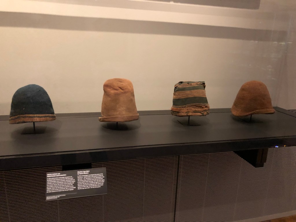 I also loved Winter Landscape with Skaters by Hendrick Avercamp, c. 1608 and these woollen caps worn by Dutch whalers who had died in the 17th century. Archaeologists investigated the graves of 185 Dutch whale hunters who died on or near Spitsbergen in the 17th century. Many skeletons were still wearing their knitted woollen head coverings. The men were bundled up against the severe cold and could only be recognised by the colours and patterns of their caps and the scientists believe that is why the caps went with them to their graves. As a keen knitter of woollen caps, I found this story heart-warming knowing someone who loved each of these men had knitted their caps.