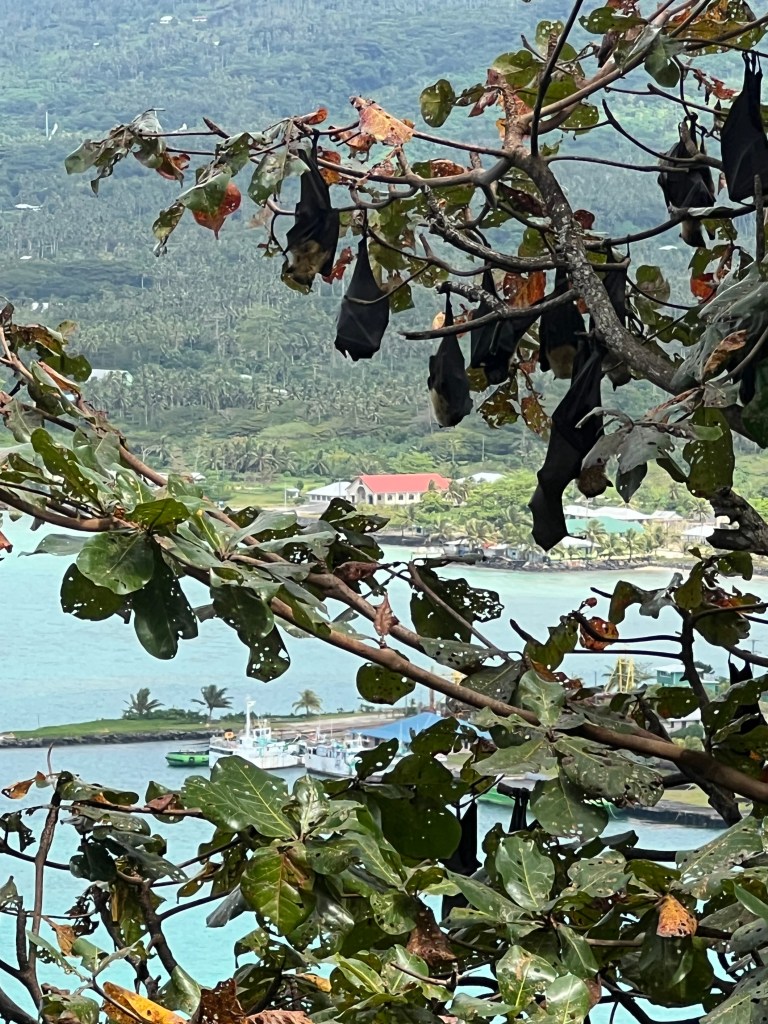 The morning became a bit overcast so Robyn and I decided to hike up the hill in the centre of the island and see if we could find the bat colony that we’d heard lived there. We scrambled up the trail, in places doing more rock climbing than walking on a true path but made it up to the top. We found fantastic views out to the ocean and we found the bat colony who were very loud for a Sunday morning!