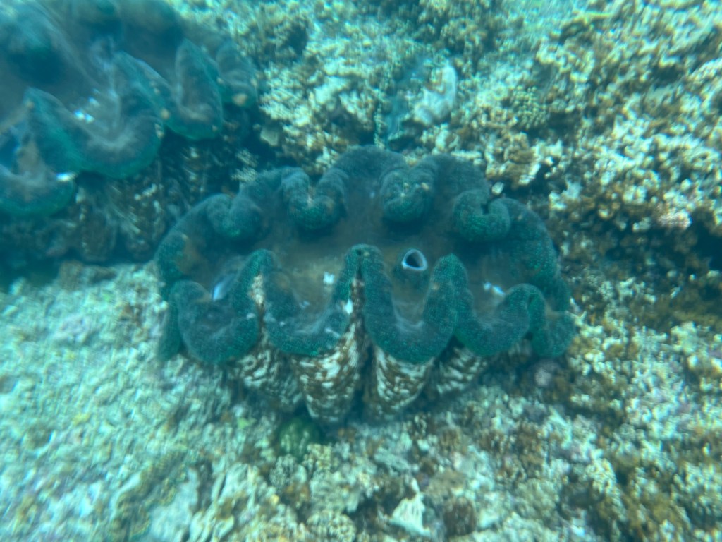The water is warm, calm and crystal clear which provides the feeling that you are in an aquarium. Within minutes, I spotted my first clam and was transported to an underwater wonderland. Their iridescent jewel colours were quite a surprise. The clams come in a variety of colours and patterns due to the photosynthetic algae that lives in their tissues. The photosynthetic algae produce food for them, which is why giant clams need to live in shallow water, so that sunlight reaches the algae. (Full disclosure, my underwater photos aren’t very good. It was my first time using my new underwater phone pouch and it’s clear that I need more practice! But at least you can kind of get the idea of what they looked like.)
