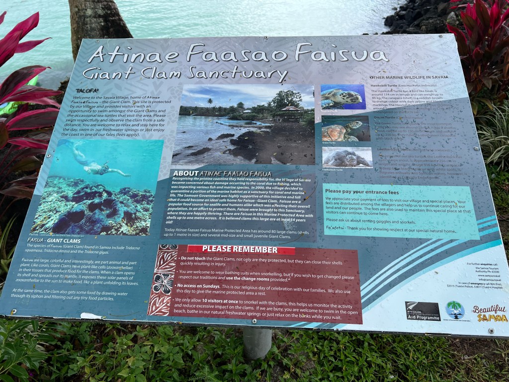 The clams of this sanctuary are well protected by their villagers who are proud to care for the sanctuary. Visitors who wish to swim or snorkel in the sanctuary pay the village $20WST ($11.50 AUD/$7.50USD/ £5.50GBP) for the opportunity. Diving is not allowed, nor is touching the clams. The community also has kayaks available for those who prefer.
